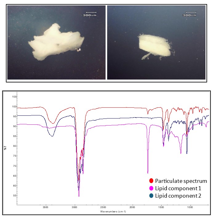 Photomicrographs of white particulates in solution ~1 hour after thawing. FT-IR spectroscopy revealed that these particulates are consistent with lipid components of the drug product.