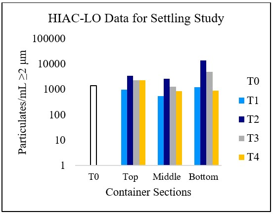 Comparison of top, middle, and bottom of containers in a homogeneity assessment study. Settling trends were not identified over time. Thus, the final drug product was determined to remain homogeneous during the hold, enabling a process change for shutting off the mixers early. *T0 was homogenous and not sampled across different regions in the container.