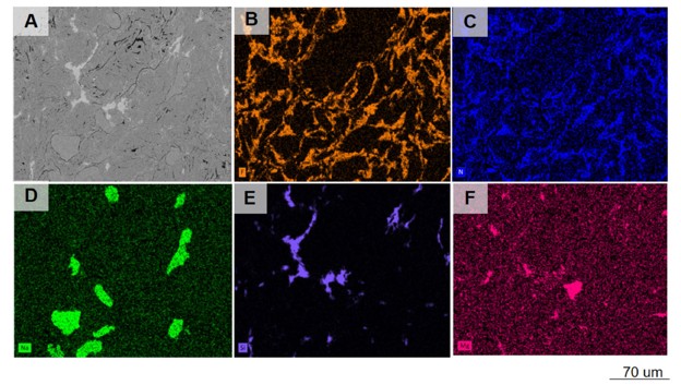 Figure 1. mSEM cross-section of the tablet core (A), and the corresponding energy dispersive X-ray spectroscopy (EDX) elemental maps of (B) Fluorine; (C) Nitrogen; (D) Sodium; (E) Silicon; (F) Magnesium.