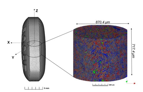 Figure 2. The 3D reconstruction of the segmented volume of the tablet, acquired using phase contrast SyncCT. The size of the volume and its location in the tablet are illustrated. API: blue; microcrystalline cellulose (MCC): gray; croscarmellose sodium (CCS): green; pores: red.