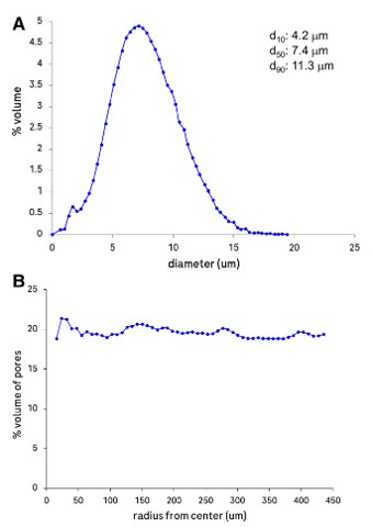 Figure 3. (A) Pore size distribution of the tablet, derived from the segmented volume; (B) Cylindrical representative elementary volume (REV) plot showing the local porosity in the tablet as the function of the distance from the origin.