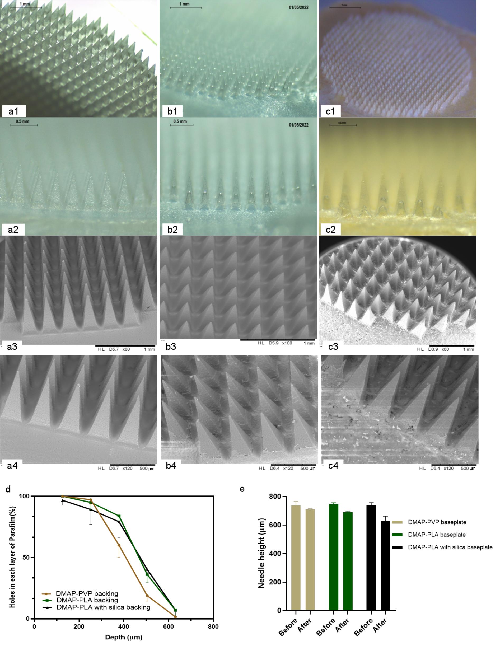 Figure 1. Morphology of PVP-DMAPs (a1-4), PLA-DMAPs (b1-4) and PLA silica-DMAPs (c1-4) obtained by optical microscope and SEM. Results of the Parafilm®M insertion test (d) (Means-SDs, n=5) and height reduction test (Means + SDs, n=5) (e) of DMAPs with PVP, PLA and PLA with a silica infued-baseplate.