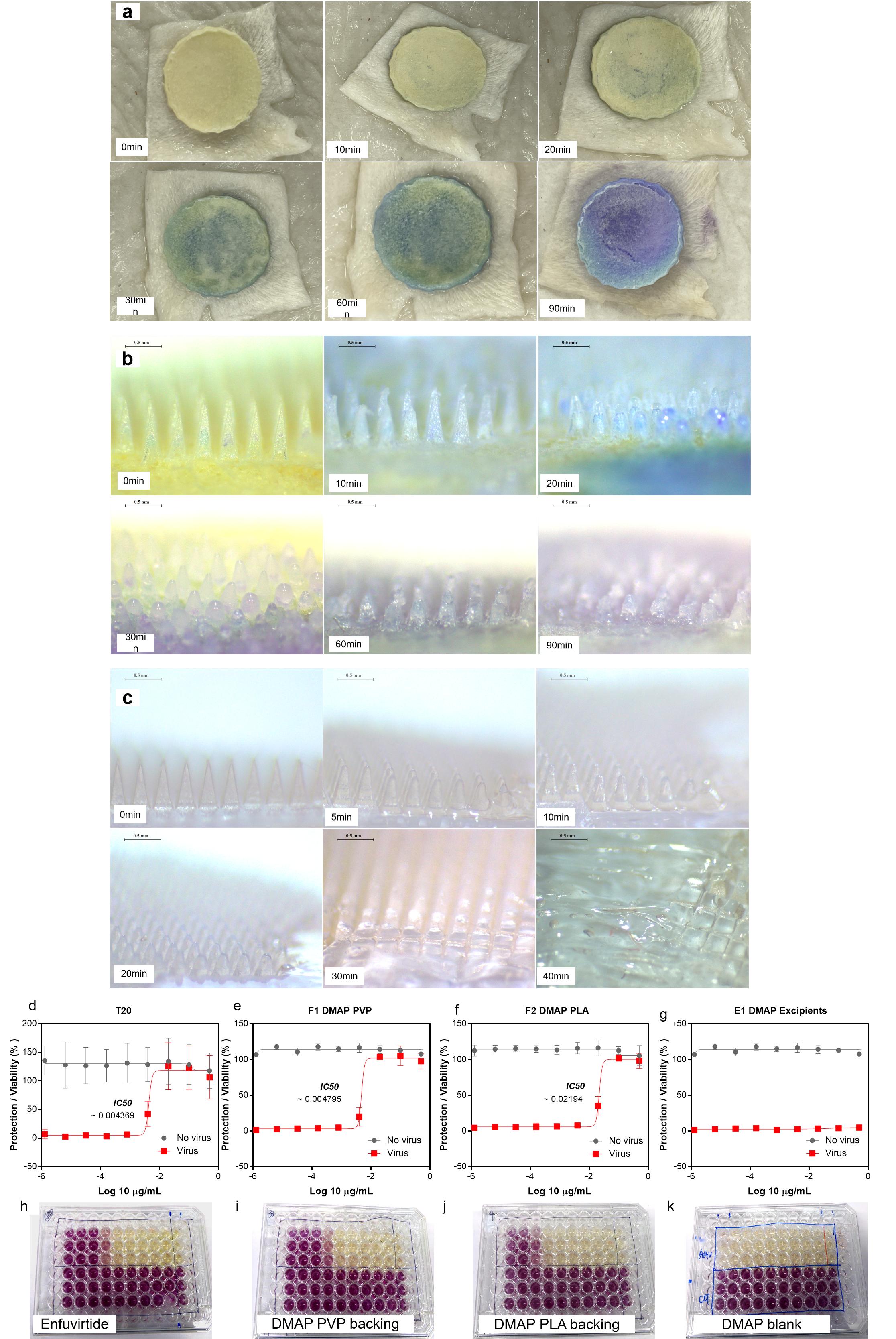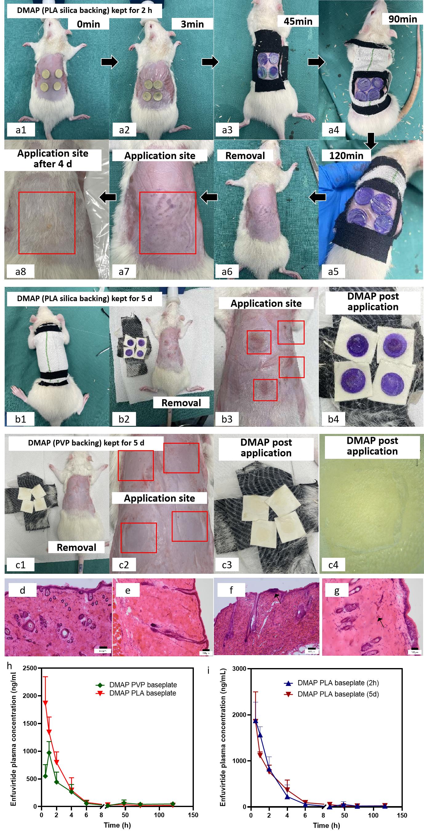 Figure 3. Ex vivo dissolution (a, c) and baseplate colour change (b,d) for FITC-dextran (a, b) and fluorescein sodium (c, d) dissolving microneedle. Ex vivo delivery of the two dissolving microneedles (e) and distribution of the analytes (mean±SD, n = 3) (f). Preliminary result from dissolving microneedles with the feedback system on rats (g).