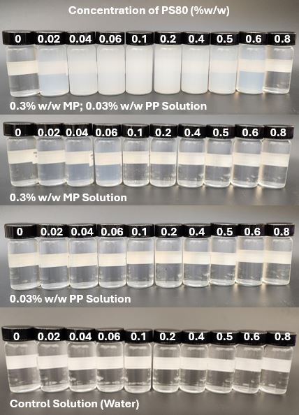 Figure 1. Images taken of solution samples made with titrated concentrations of Polysorbate 80 at T=0. Pictured from top to bottom are the following solutions: 0.3% w/w Methylparaben and 0.03% w/w Propylparaben Solution; 0.3% w/w Methylparaben Solution; 0.03% w/w Propylparaben Solution, and the Control Solution (Water).
