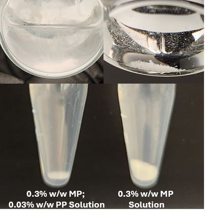 Figure 2. Images taken of precipitation observations noted in samples containing 0.10% w/w Polysorbate 80 following T=5 Months storage at CRT. The solution containing only Methylparaben yielded a large granular precipitate, whereas the solution containing both Methylparaben and Propylparaben resulted in a lesser amount of fine precipitate.