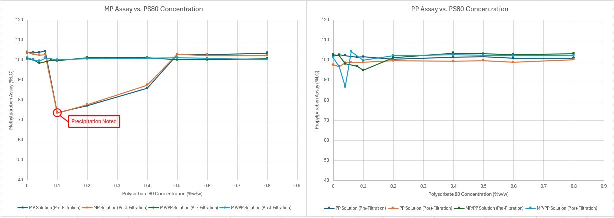 Figure 3. Graphs illustrating the changes in paraben concentration (%LC) with increasing concentrations of Polysorbate 80 (%w/w) both pre- and post-filtration with a 0.2µm PES sterile filter. Pictured on the left are the two solutions containing Methylparaben, on the right are the two solutions containing Propylparaben.