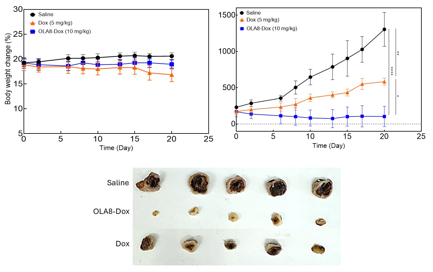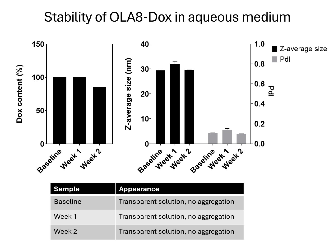 Size distribution and aqueous stability of OLA8-Dox analyzed by DLS and HPLC