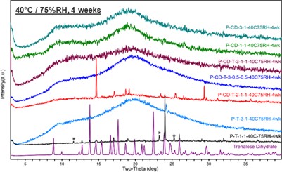 PXRD patterns of spray-dried mAb1 in different formulations after stress at 40 °C/75% RH for 4 weeks