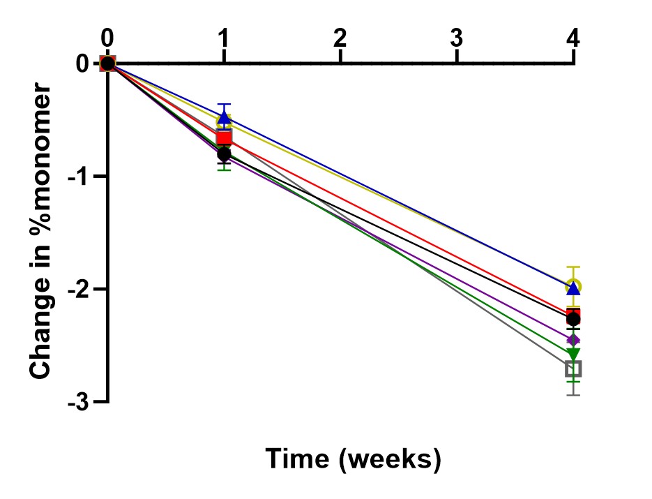 Changes in percent monomer over 4 weeks at 40 °C/75% RH for spray-dried mAb1.