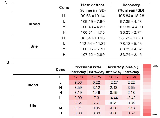 Figure 1 (A) Matrix effect and Recovery of DHEAS in blood and bile samples, and (B) Heat plots of precision (%CV) and accuracy (%Bias) of intra-day and inter-day for DHEAS quantification