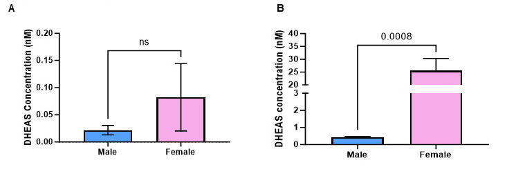 Figure 2 Quantification of DHEAS in (A) blood and (B) bile comparing between male and female rats (n = 3 per sex). Data are presented as the means ± SD. P-values were determined by unpaired Student's t-test.