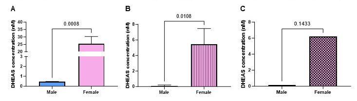 Figure 3 Concentration of DHEAS in bile samples obtained from different species comparing between male and female (A) Rats, (B) Bovine, and (C) Porcine (n = 3 per sex). Data are presented as the means ± SD. P-values were determined by unpaired Student's t-test.