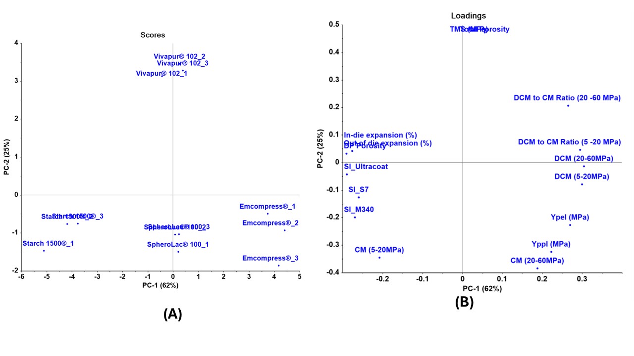 Figure 1 (A) The principal component (PCA) score plot: (B) Loading plot of material strength, material deformation properties, and sticking index. The first two principal components display explain 87% data variance.
