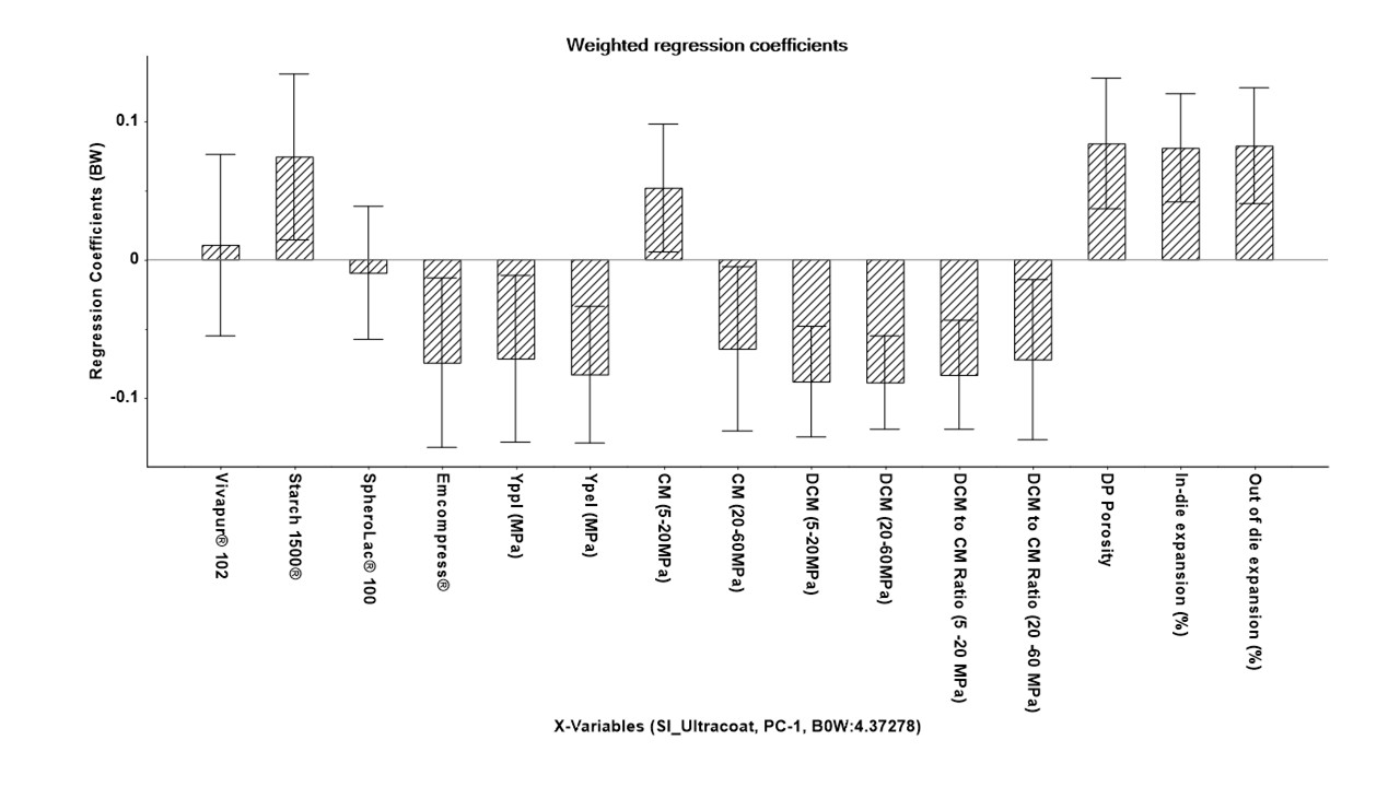 Figure 2 A representative Principal component regression (PCR-1) model for Sticking Index with M340 metal coupons. The significance of regression is determined by full cross-validation and Marten’s uncertainty test and corresponds to approximately p<0.005. Bars are 95% confidence bars. A positive (+) and negative (-) sign indicates a positive and negative impact on material’s M340 SI index.