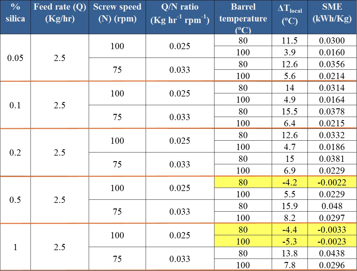 Table 1: Granulations runs at different silica levels and processing conditions with its corresponding ΔTlocal and SME (runs where granule growth was not observed are highlighted in yellow).