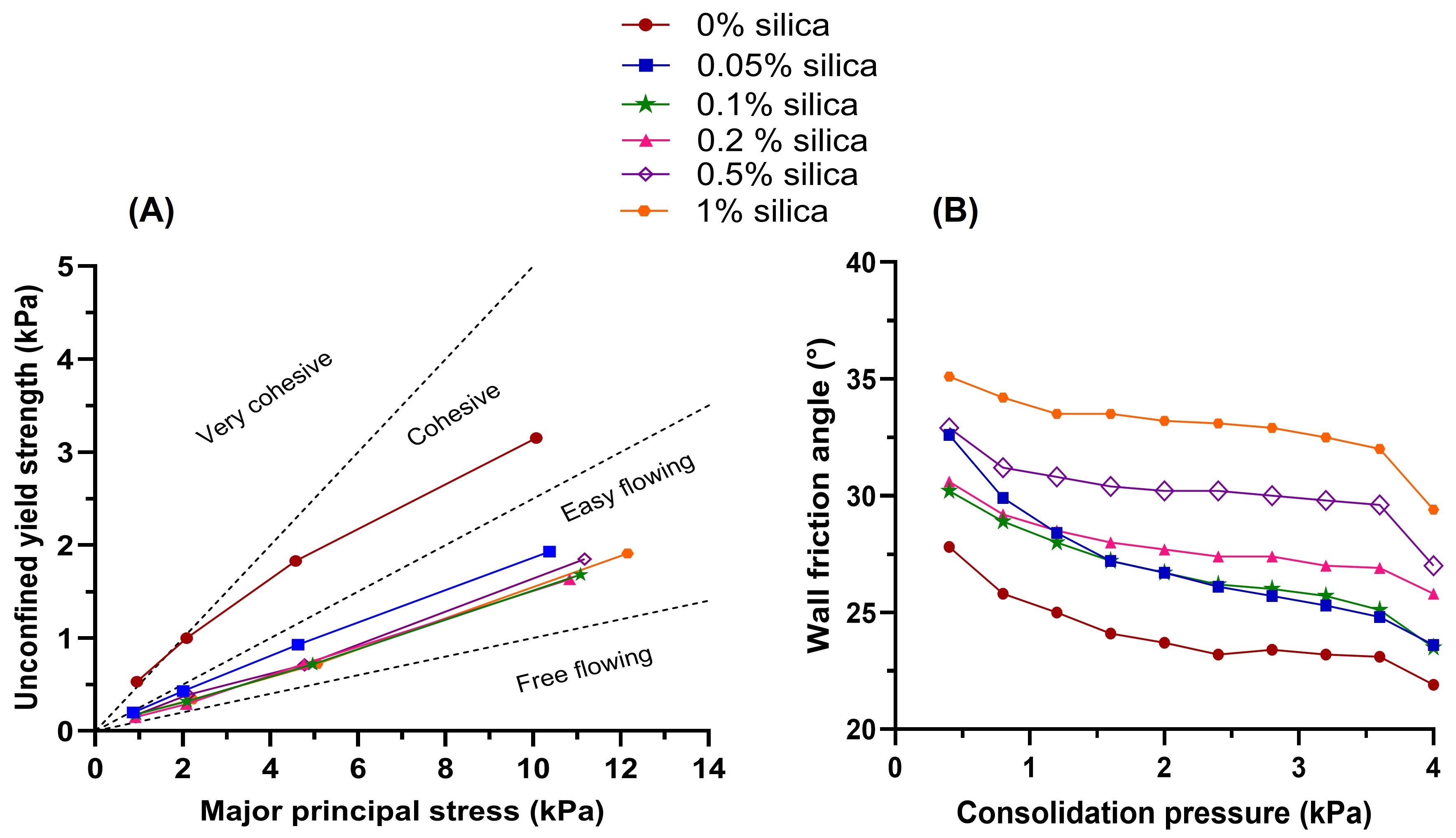 Figure 1: Powder rheology of 95%APAP and 5% Klucel FusionTM X HPC blend containing different levels of silica- A) Unconfined yield strength of powder blend represents the powder’s cohesive strength and internal friction and B) Wall friction angle (WFA) represents the powder-wall friction.
