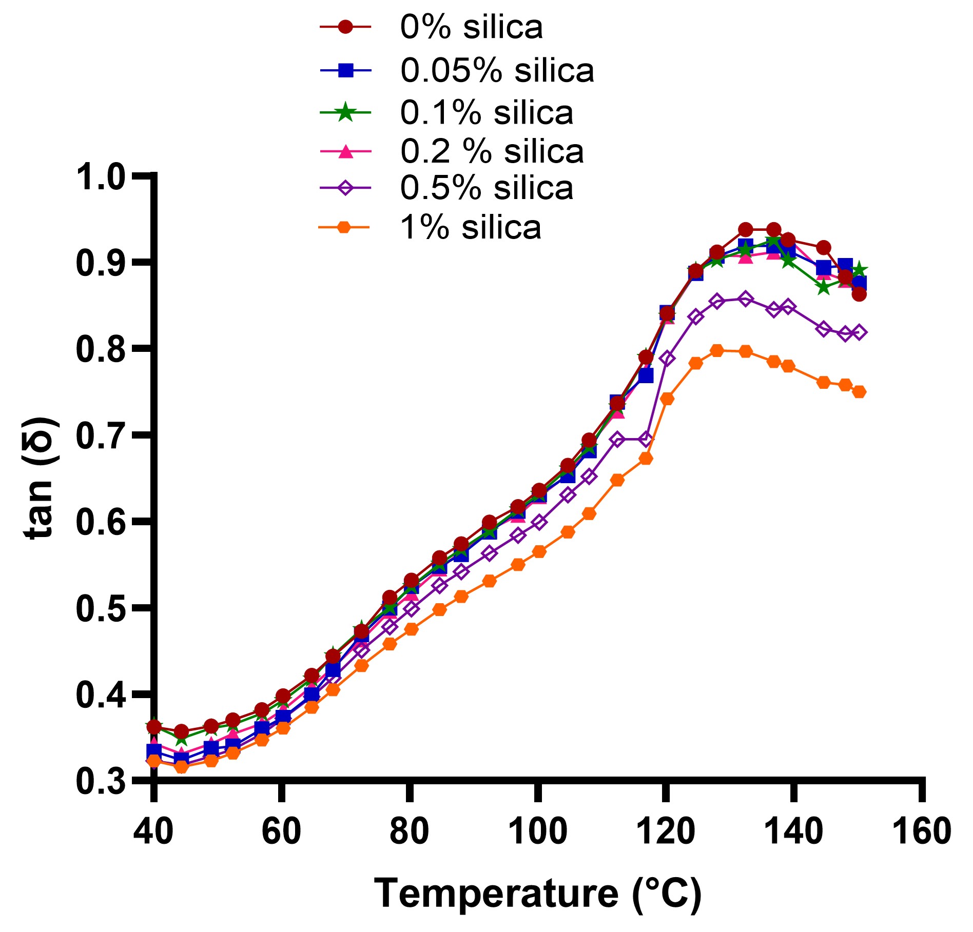 Figure 2: Tan (δ) values as a function of temperature for Klucel FusionTM X HPC at different silica levels. Temperature ramps were performed from 40 ºC to 150 ºC in controlled deformation oscillation mode with a shear strain amplitude of 0.01% and angular frequency of 6.283 rad/s.