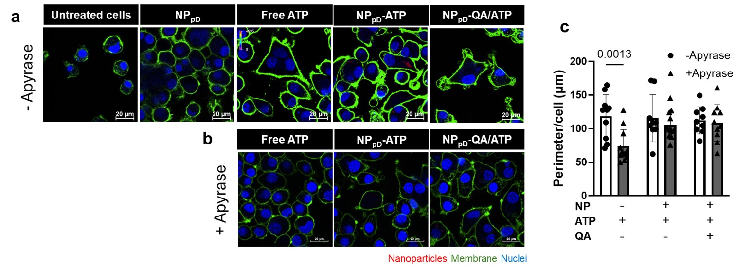 Fig.1. ATP-modified NPs (NPpD-ATP and NPpD-QA/ATP) activate dendritic cells. (a) Free ATP, NPpD-ATP and NPpD-QA/ATP activate JAWSII dendritic cells causing their morphology change. NPpD-QA/ATP showed comparable activity to NPpD-ATP and free ATP in activating JAWSII cells. (b) Morphology of JAWSII dendritic cells treated with free ATP, NPpD-ATP and NPpD-QA/ATP in the presence of apyrase (ATP degrading enzyme) for 6 h. (c) Graph shows perimeters of cells, an indication of dendritic cell activation.