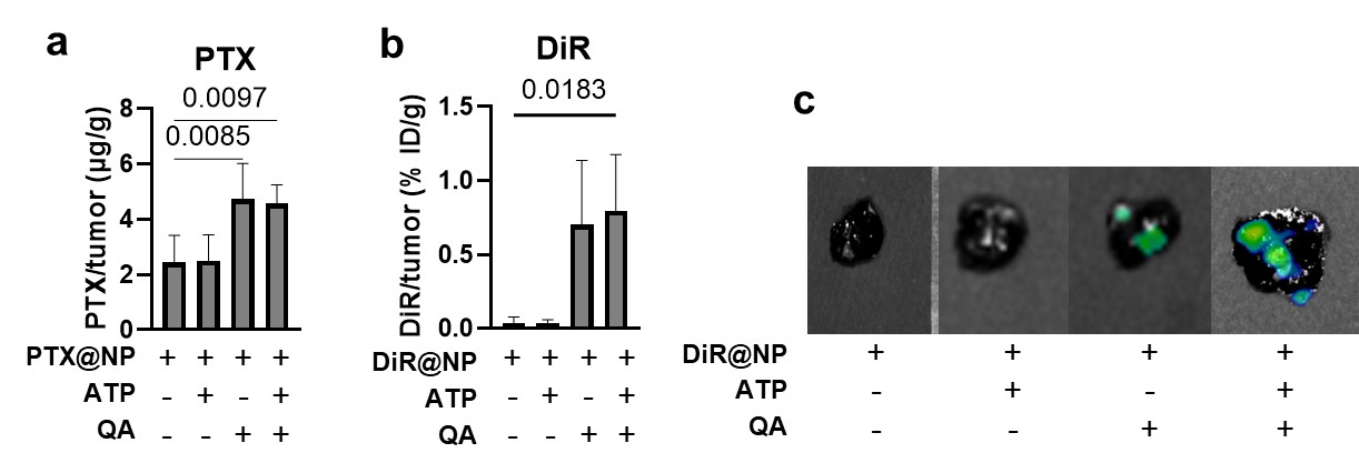 Fig.2. QA-modified NPs (NPpD-QA and NPpD-QA/ATP) increase tumor accumulation of payloads (PTX or DiR dye). (a) PTX content in B16F10 tumors at 24 h after a single intravenous injection of NPs (Unmodified NPs, NPpD-ATP, NPpD-QA, or NPpD-QA/ATP) delivering PTX 20 mg/kg. (b) DiR content in B16F10 tumors at 24 h after a single intravenous injection of DiR-loaded NPs. (c) Ex vivo imaging of B16F10 tumor at 24 h after single intravenous injection of DiR-loaded NPs. % ID: % of the injected dose.