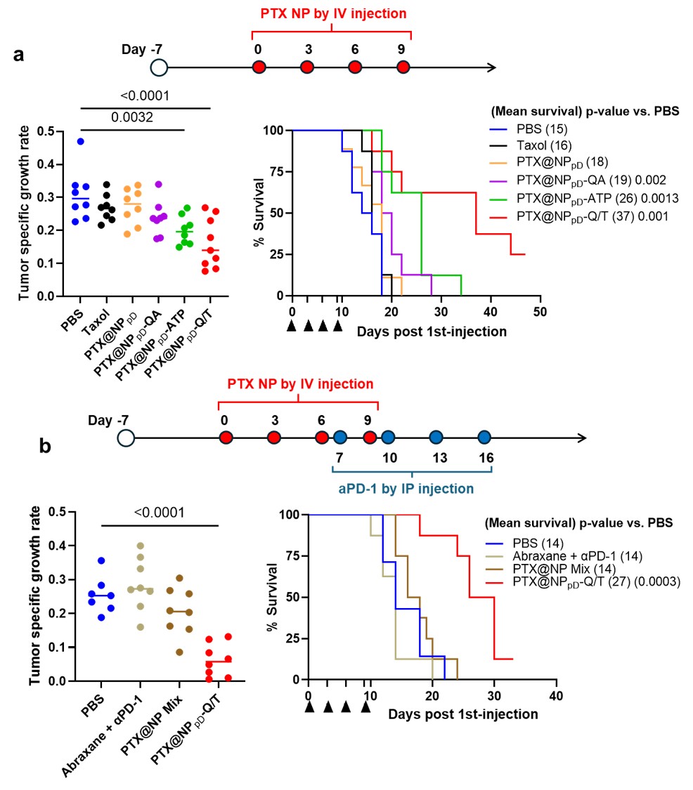 Fig.3. Dual modified NPs (PTX@ NPpD-QA/ATP) improve antitumor efficacy of PTX against B16f10 melanoma. (a) PTX@ NPpD-QA/ATP compared with Taxol®, PTX@ NPpD-QA, PTX@ NPpD -ATP and PTX@ NPpD, (b) PTX@ NPpD-QA/ATP compared with a mixture of PTX@ NPpD-QA and PTX@ NPpD -ATP or a combination of Abraxane and anti-PD1 antibody (PD-1). All groups (except for PBS) received treatments equivalent to PTX 20 mg/kg/dose. Tumor specific growth rate= ln(V2/V1) / (t2 - t1), where V1 and V2 are tumor volumes at time t1 and t2, respectively. PTX@ NPpD-Q/T: PTX@ NPpD-QA/ATP. PTX@NP Mix: mixture of PTX@ NPpD-QA and PTX@ NPpD -ATP.