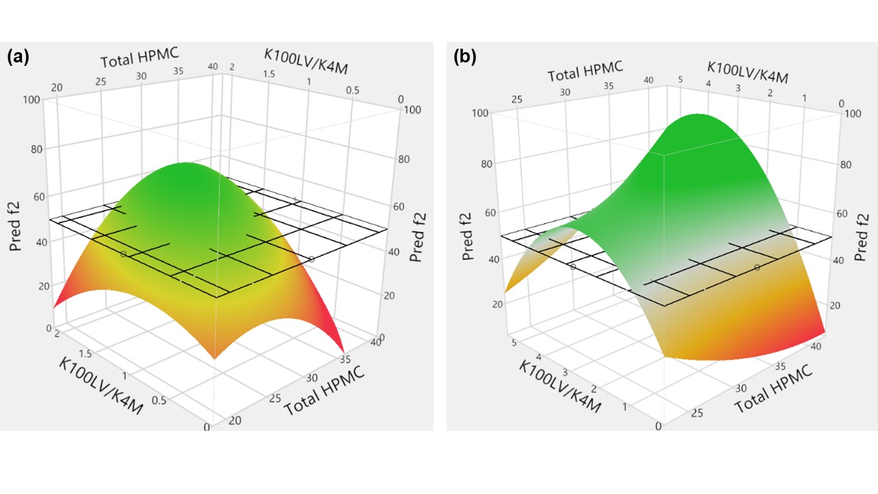 Figure 1. Response surface plots generated using JMP® to visualize the design space for (a) EQ 200 mg Base and (b) EQ 300 mg Base strength quetiapine fumarate extended-release tablet formulations. Formulation compositions with predicted similarity factor f2 (Y axis) ≥ 50 (Green zone above the grid surface) compared to the reference listed drug Seroquel XR® products were defined as the safe formulation design space. Two grades of HPMC K100LV and K4M were studied.