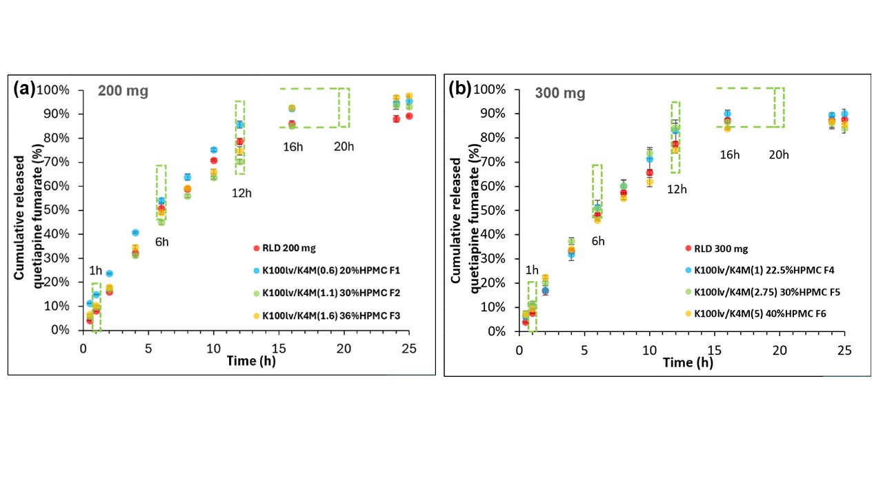 Figure 2. The in vitro dissolution profiles of LM QF ER tablet formulations across the 200 mg and 300 mg strengths obtained using USP apparatus 1 at 200 rpm (250 after 24 hr) with 20-mesh baskets in biphasic media (0.05 M citric acid and 0.09 N NaOH, pH 4.8 for first 5 hours followed by the addition of 100 mL of 0.05 M dibasic sodium phosphate dodecahydrate and 0.46 N NaOH to achieve a final pH of 6.6) (n=3, mean±SD). (a) EQ 200 mg Base strength: formulations F1 (K100LV/K4M ratio=0.6, 20% total HPMC), F2 (K100LV/K4M ratio=1.1, 30% total HPMC) and F3 (K100LV/K4M=1.6, 36% total HPMC) with f2 factors of 59.71, 64.97, and 53.70, compared to Seroquel XR® EQ 200 mg Base strength. (b) EQ 300 mg Base strength: formulations F4 (K100LV/K4M= 1, 22.5% total HPMC), F5 (K100LV/K4M= 2.75, 30% total HPMC) and F6 (K100LV/K4M=5, 40% total HPMC) with f2 factors of 71.79, 67.06, and 73.22, compared to Seroquel XR® EQ 300 mg Base strength. USP dissolution specifications (Test 1) for QF release are indicated by dashed green boxes.