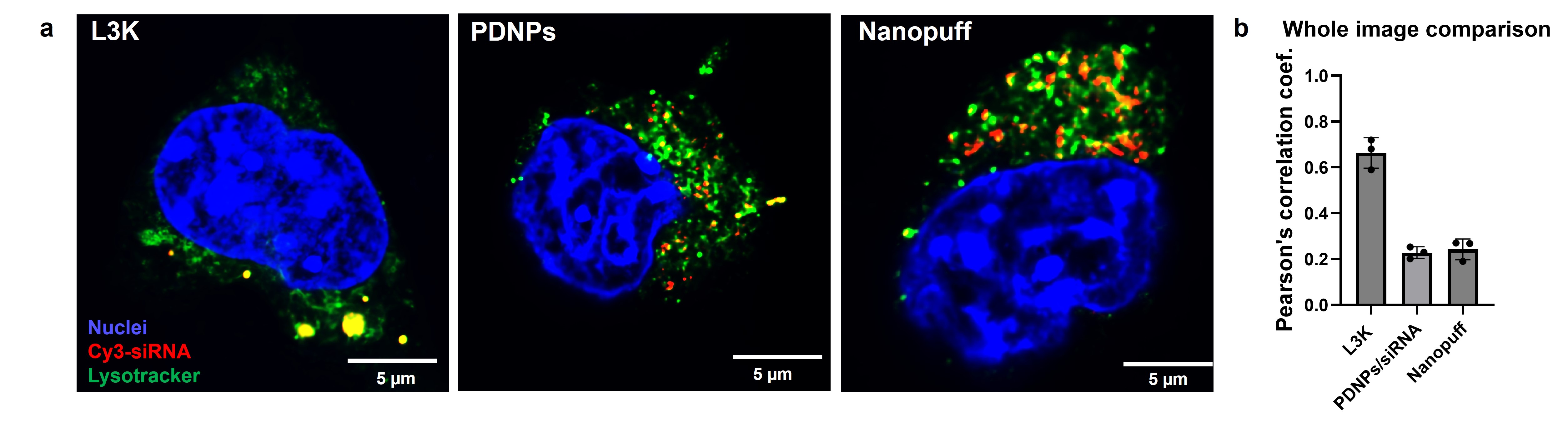 Fig. 1. (a) Confocal microscope images locating Cy3-siRNA-loaded Lipofectamine 3000, PDNPs, and Nanopuff relative to lysosomes in B16F10 cells. Green: Lysotracker (lysosome); red: Cy3-labeled siRNA; and blue: DAPI (nuclei). (b) Pearson’s correlation coefficients indicating the degree of siRNA & lysosome colocalization in confocal images: R = 1 (perfect colocalization), and R = 0 (no colocalization). n = 3 confocal dish of a representative image (mean ± SD).