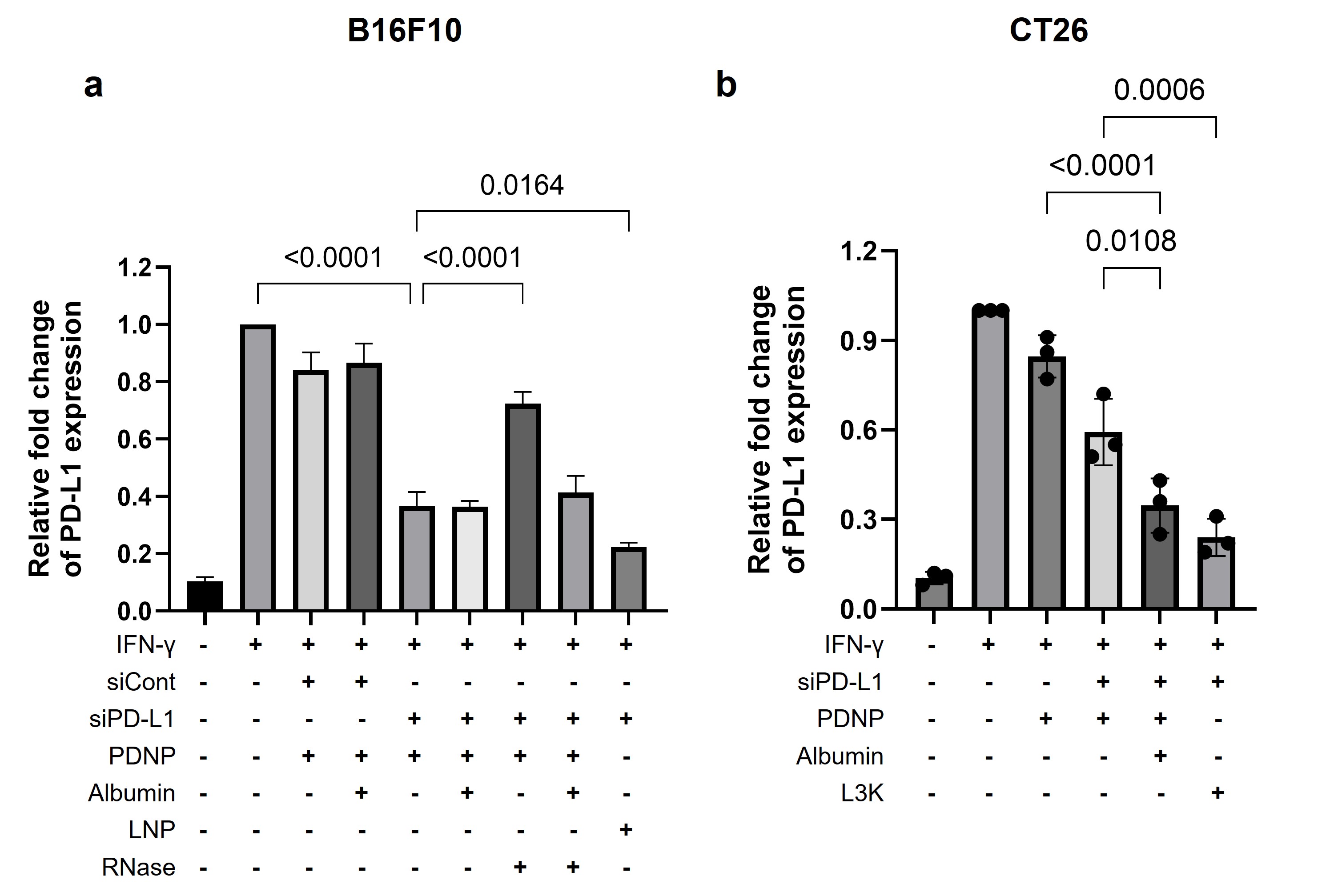 Fig. 2 RT-qPCR analysis of PD-L1 gene silenced by siPD-L1@LNP(MC3), siPD-L1@L3K, siPD-L1@PDNPs, and siPD-L1@Nanopuff (albumin-bathed PDNP) in (a) IFN-gamma activated B16F10 and (b) IFN-gamma activated CT26 cells. n = 3 test of a representative batch, mean ± SD, Tukey's multiple comparisons test following one-way ANOVA.