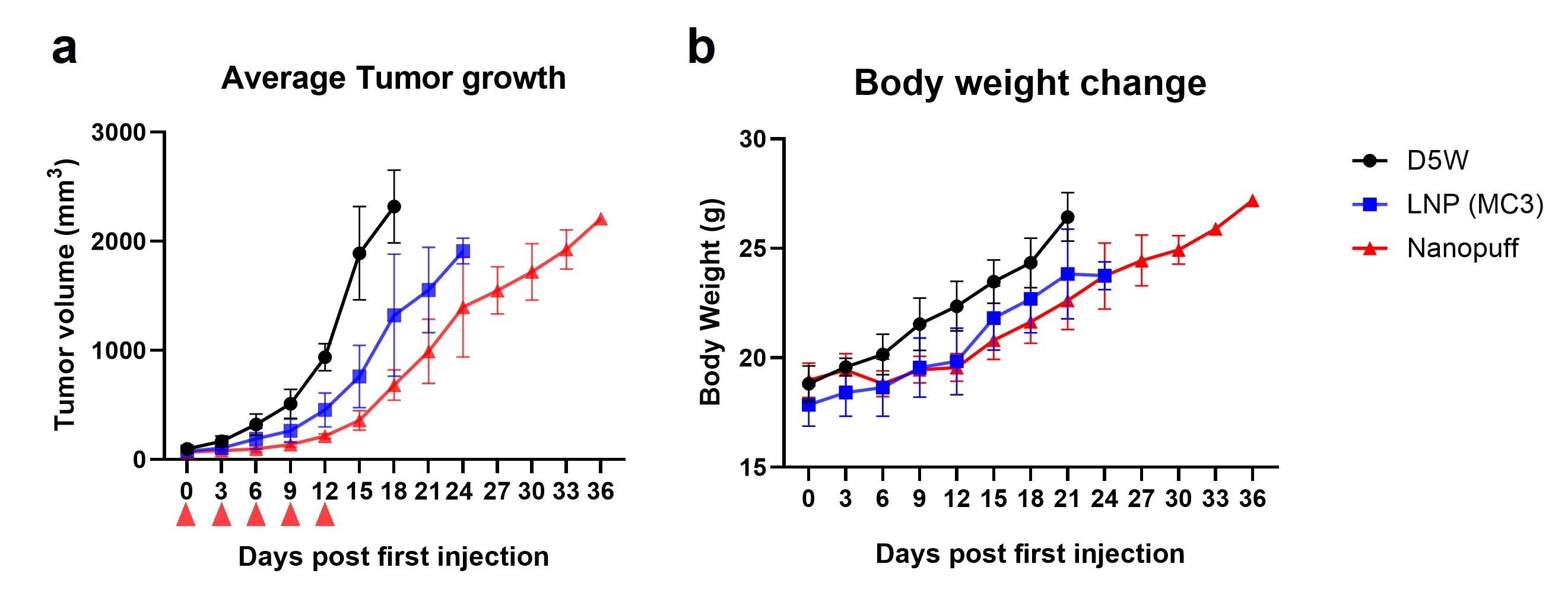 Fig 3. Antitumor efficacy of D5W, siPD-L1@LNP, and siPD-L1@Nanopuff in Balb/c mice bearing CT26 tumors (siPD-L1: 0.75 mg/kg, Intravenous injected every 3 days for 5 times). n = 5 mice per group (mean ± stdev). Tumor volume (a) and weight of the mice (b) were measured every 3 days to evaluate the efficacy and toxicity of the particles.