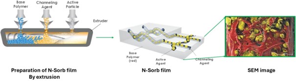 Figure 1. Representations of Activ-Polymer™ N-Sorb film preparation process by extrusion (left); High-resolution scanning electron microscopy image coupled with EDX analyses of an N-Sorb film (right).