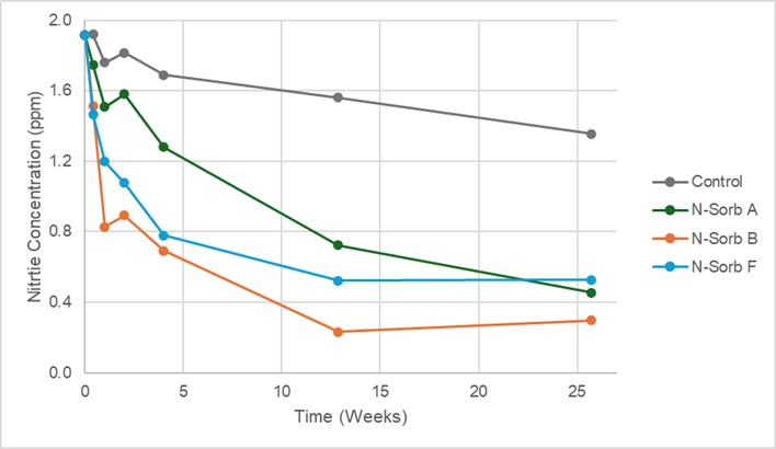 Figure 2. Evolution of nitrite concentration in MCC tablets at 25°C as a function of time in the absence or the presence of N-Sorb films.