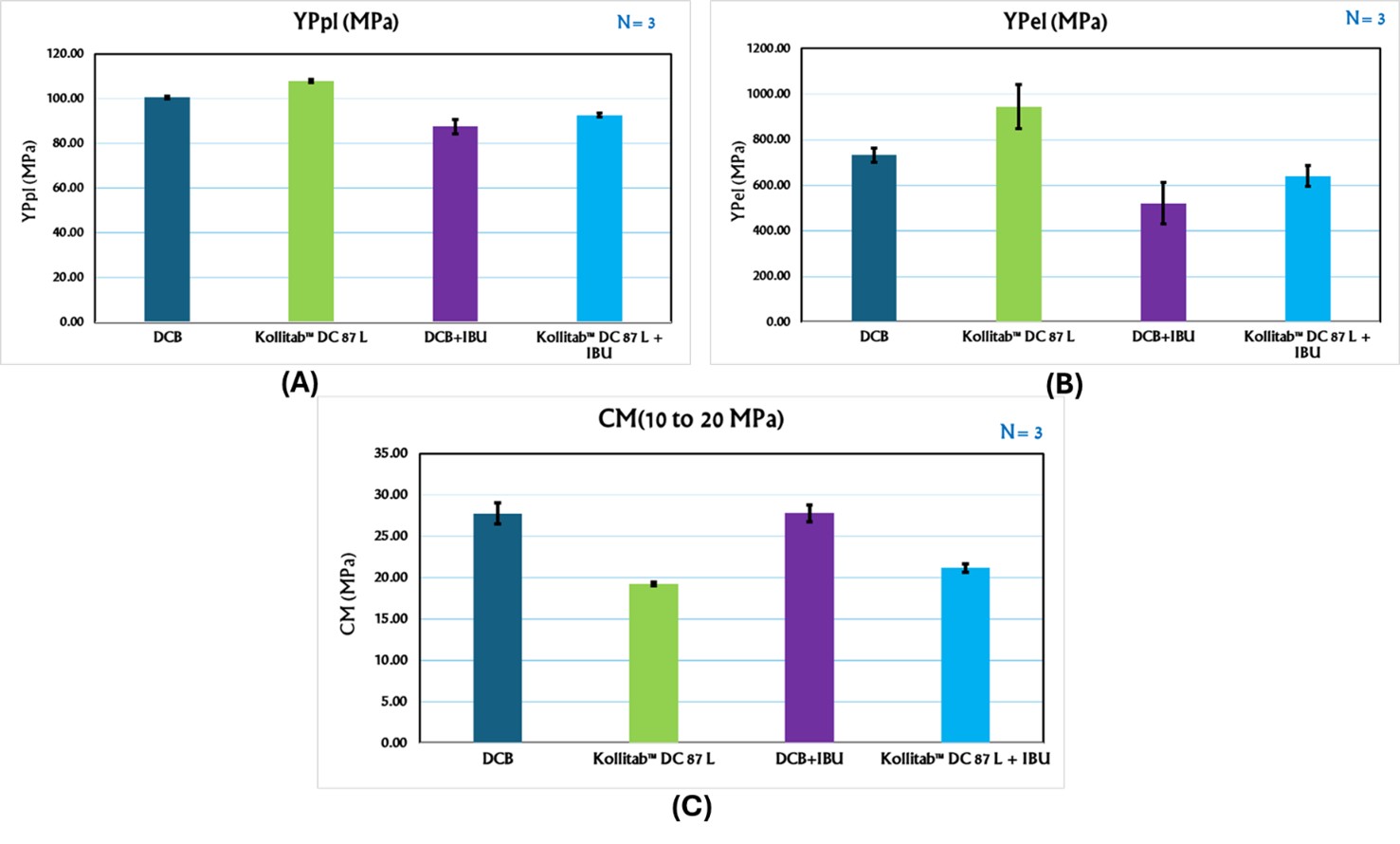 Material profiling (A) Heckel YPpl; (B) Heckel YPel; and (C) compression moduli of Kollitab™ DC 87L and its components physical blend with and without ibuprofen