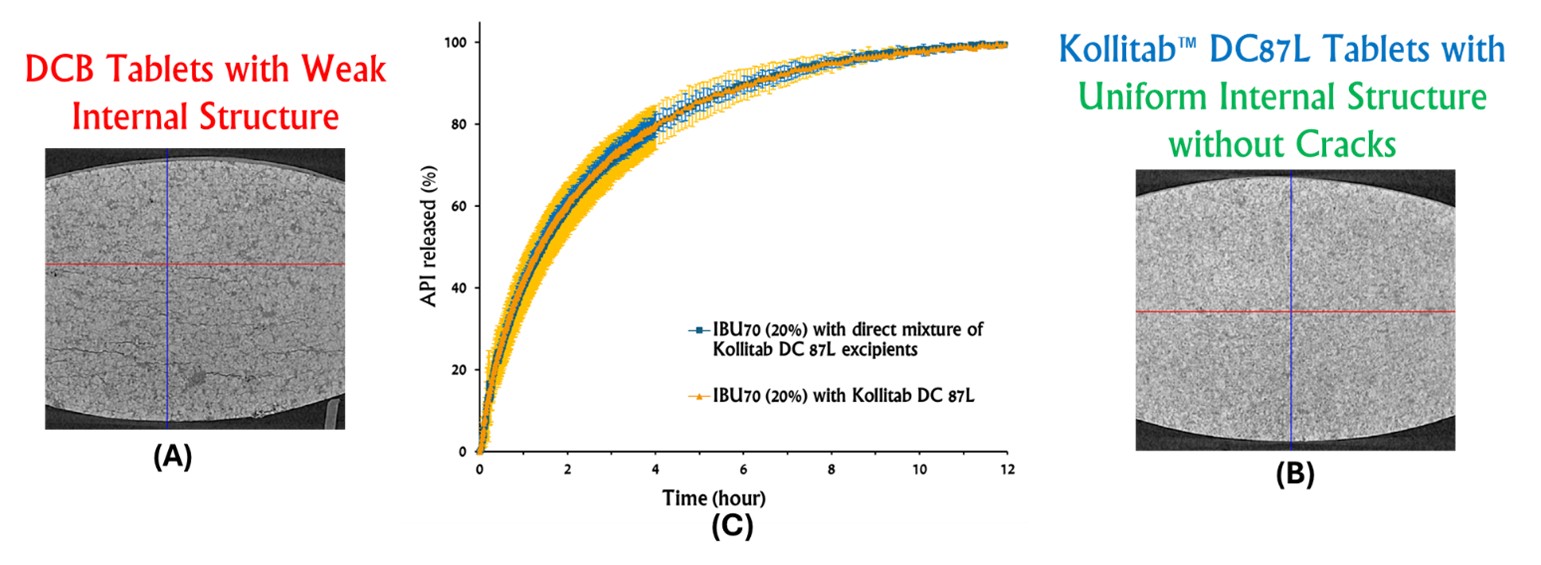 Correlation of tablet internal structure obtained from X-ray CT scan with dissolution performance (A) X-ray CT scan of Kollitab™ DC 87 L components physical blend tablet; (B) (A) X-ray CT scan of Kollitab™ DC 87 L tablet; (C) Ibuprofen release from Kollitab™ DC 87 L components physical blend tablet and Kollitab™ DC 87 L tablet (N=6).