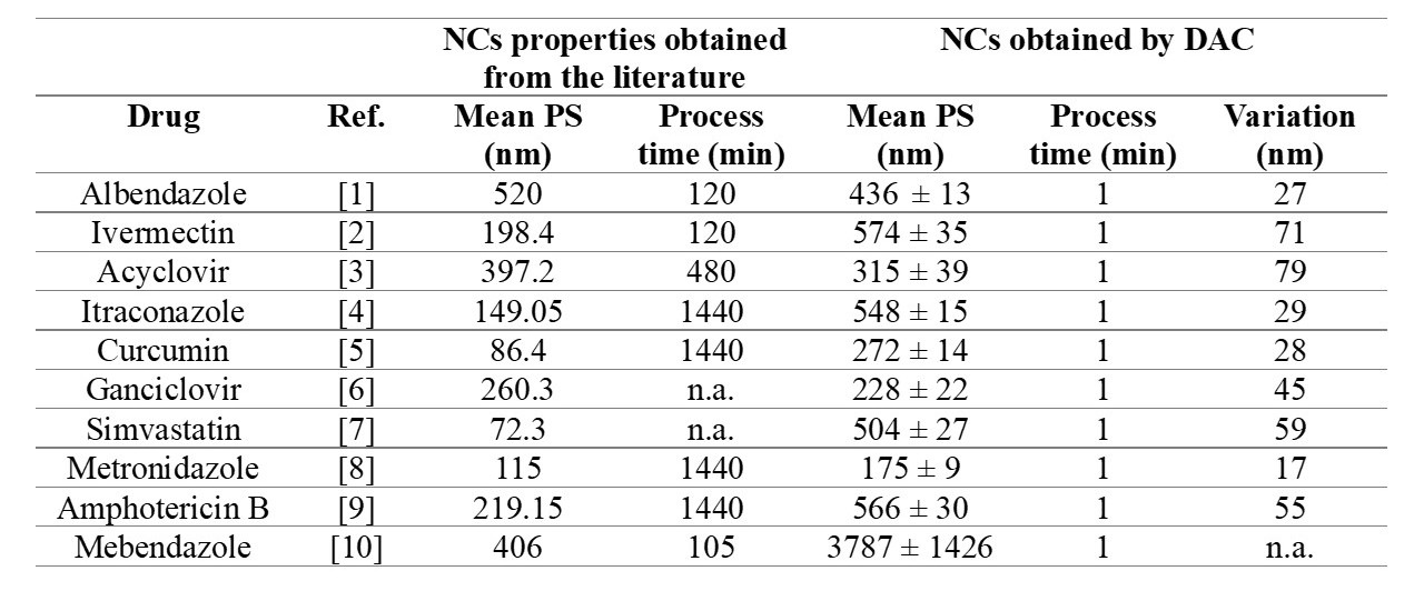 Table 1. Comparison between literature-reported PS and PDI values and those obtained after a 1-minute milling cycle (triplicates).
