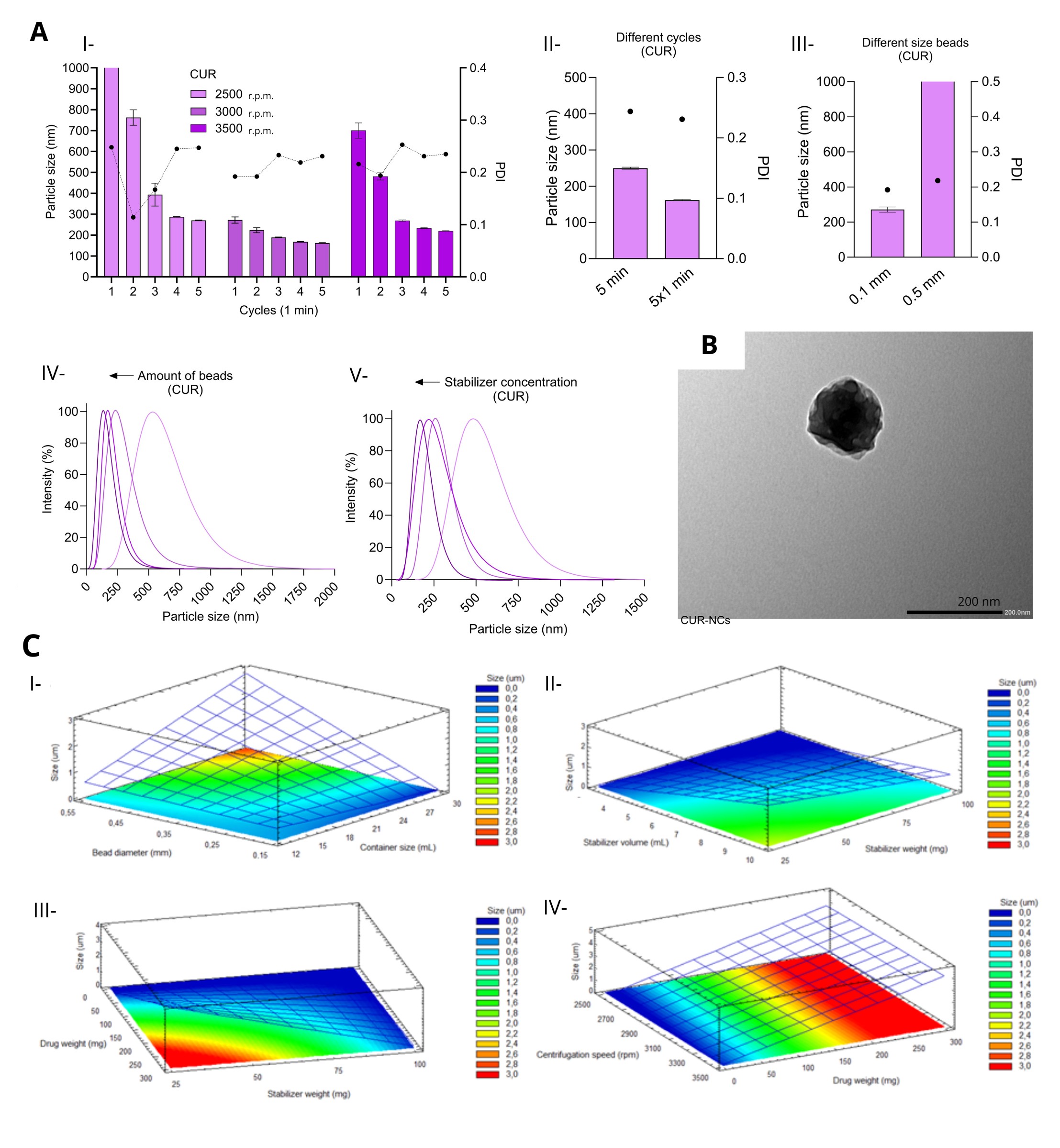 Figure 1. A) Effect of individual formulation and process parameters on CUR NCs particle size and PDI. B) TEM image. C) Response surface plots showing the impact of: (I) bead diameter and container size; (II) stabilizer volume and weight; (III) stabilizer and drug weight; (IV) drug weight and centrifugation speed on particle size.