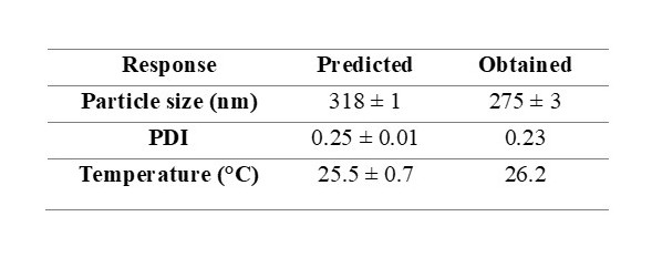Table 2. Predicted and obtained values using Plackett–Burman DoE.