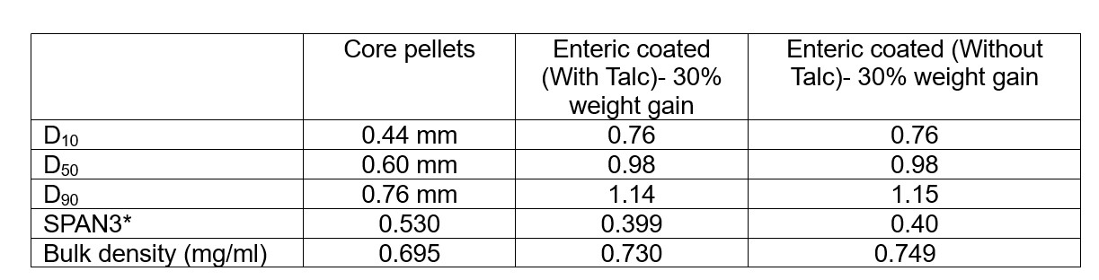 Table 1: D10, D50, D90, particle size distribution and bulk density of core and enteric pellets.