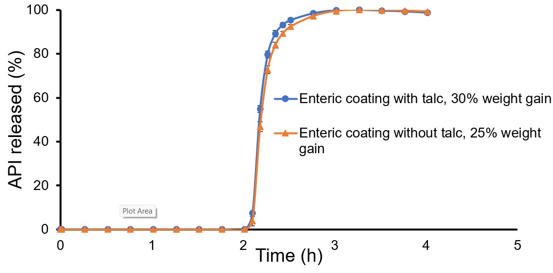 Figure 2: Comparison of in vitro dissolution data (gastric fluid, first 2 h; Intestinal fluid, after 2 h) of enterically coated omeprazole pellets coated with or without talc, n = 3