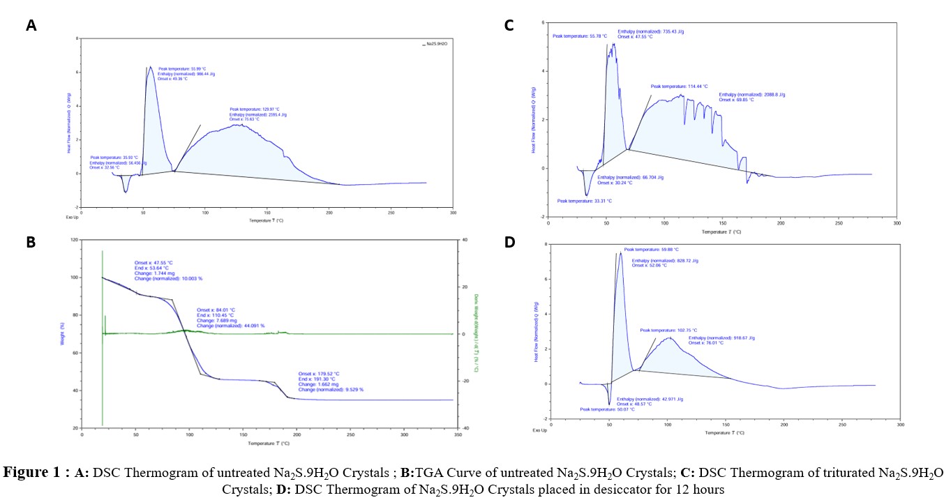 Figure 1: A: DSC Thermogram of untreated Sodium sulfide nonahydrate Crystals ; B:TGA Curve of untreated Sodium sulfide nonahydrate Crystals; C: DSC Thermogram of triturated Sodium sulfide nonahydrate Crystals; D: DSC Thermogram of Sodium sulfide nonahydrate Crystals placed in desiccator for 12 hours