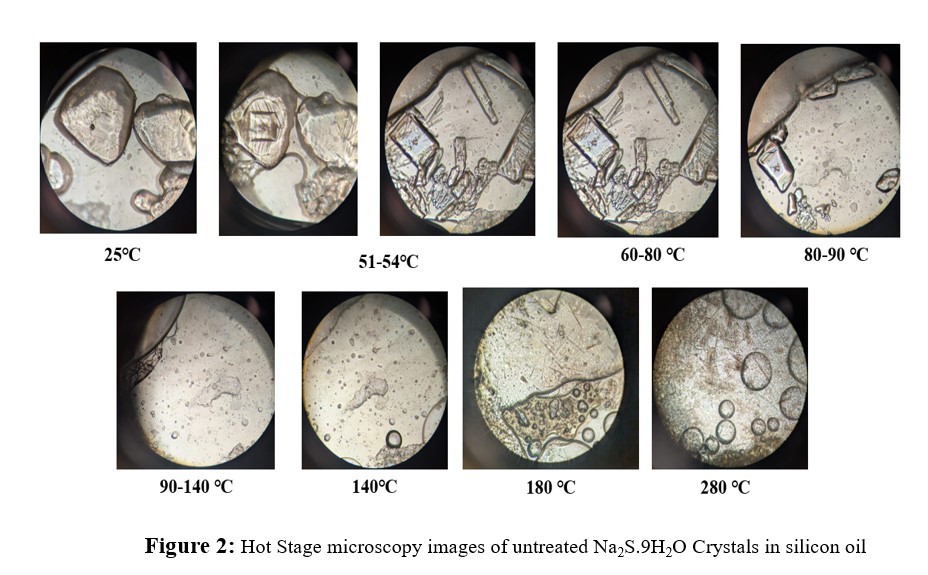 Figure 2: Hot Stage Microscopy images of untreated Sodium sulfide nonahydrate Crystals in silicon oil