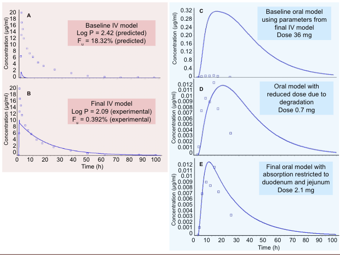Simulated (solid blue line) and observed (blue dots) plasma concentration vs. time curves for Ginsenoside Rd. A. Baseline IV model (75 mg, 30 min infusion). B. Final IV model. C. Baseline oral model (36 mg) using parameters from IV model. D. Oral model after adjustment of dose (0.7 mg). E. Final oral model after adjustment of regional absorption and dose (2.1 mg)