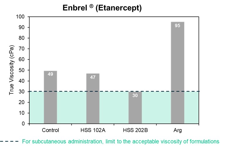 Figure 1. Viscosity-reducing effect of Hovione synthetic sugars at 100 mM. True viscosity of Etanercept (150 mg/mL) was measured at a shear rate of 3000 s⁻¹ and 25 °C.