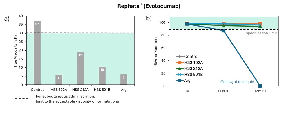 Figure 2. Viscosity-reducing effect and Stabilizing effect of Hovione synthetic sugars at 100 mM. a) True viscosity of Evolocumab (150 mg/mL) was measured at a shear rate of 3000 s⁻¹ and 25 °C. b) Stability study of high concentrated Evolocumab solutions (150 mg/mL) in the presence of Hovione sugars at 100 mM over 3 month at rt (25 ºC).