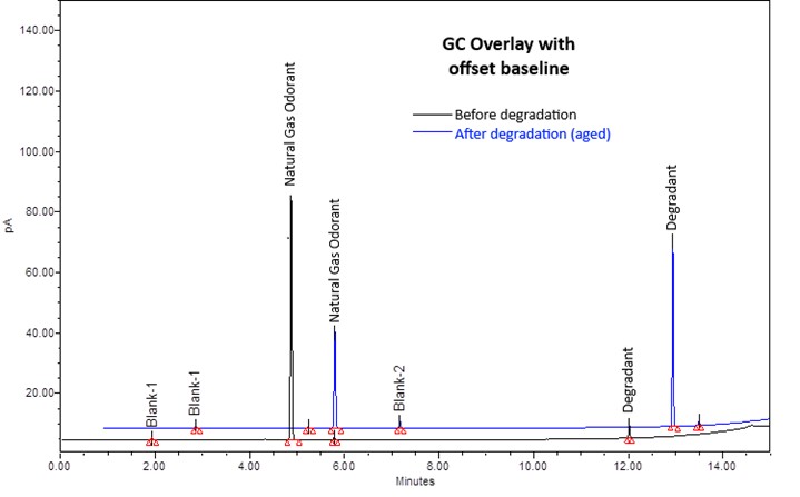 Figure 1. GC overlay showing peaks related to fresh "Nature Gas Odorant" (black) and aged/degraded "Nature Gas Odorant" (blue).