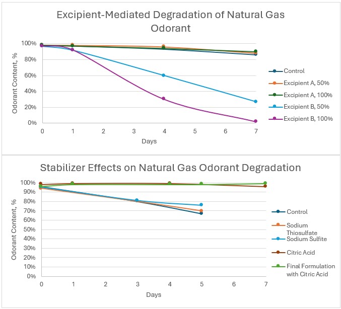 Figure 2. Top: "Nature Gas Odorant" stability over time in investigative formulations, controlling for each excipient. Bottom: "Nature Gas Odorant" stability over time when formulated with various stabilizers.