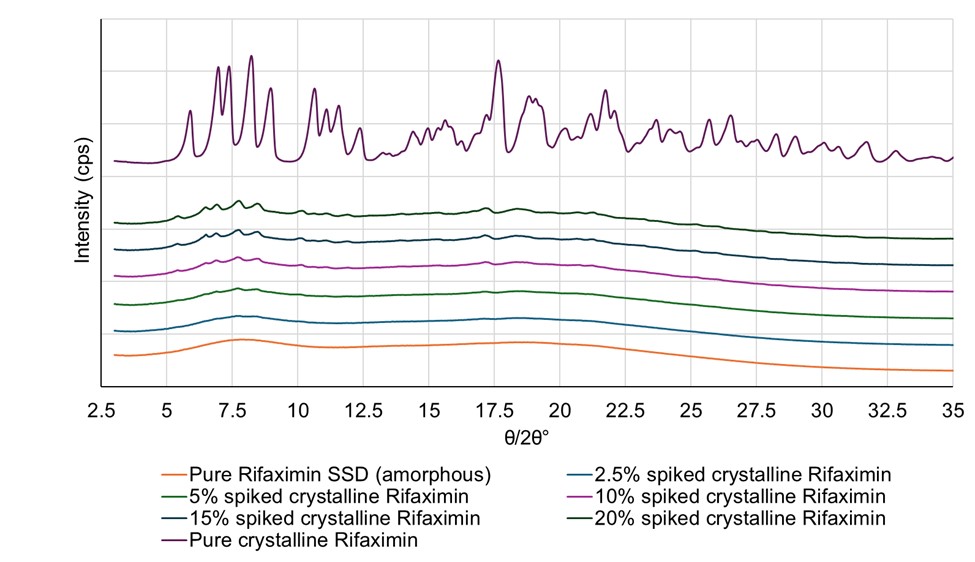 Figure 1: PXRD diffractograms of Rifaximin SSD powder with different levels of crystallinity (spiked samples).