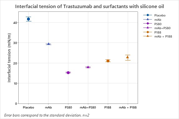 Interfacial tension of Trastuzumab and surfactants with PDMS silicone oil. The placebo refers to the Trastuzumab formulation buffer without any added surfactant. Interfacial tensions of Trastuzumab, PS80, P188, and their combinations were measured using this same placebo buffer.