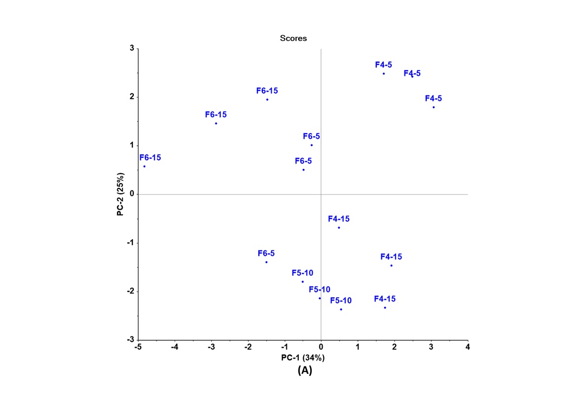 Figure 1A PCA scores plot. The first 2 principal components displayed 59% variance in the data.