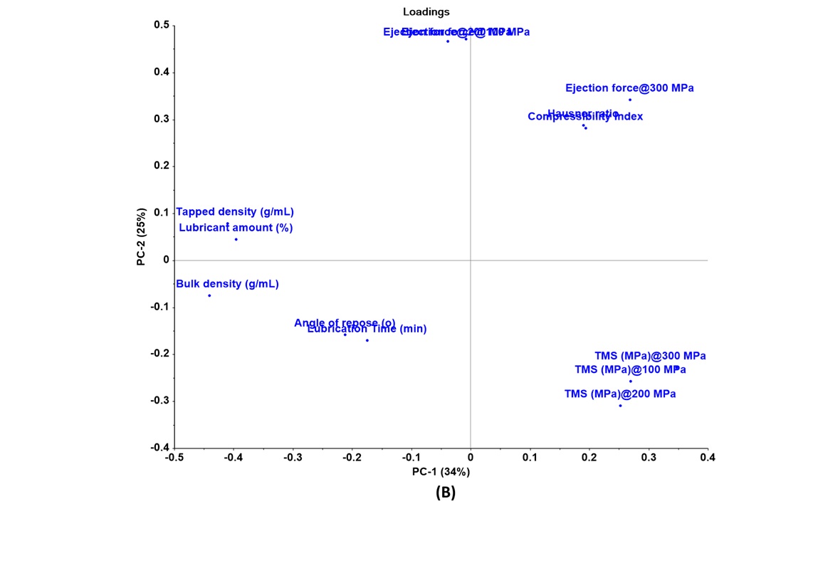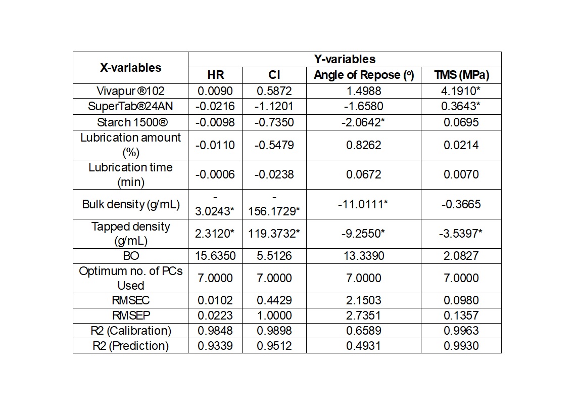 Table 1 Regression coefficients of design variables on HR, CI, angle of repose, and TMS obtained in a separate PLS-1 models. (The significance of regression is determined by full cross-validation and Marten’s uncertainty test and corresponds to approximately p<0.05; (-) indicates negative and (+) indicates positive significance. * Indicates statistically significant impact. RMSEC and RMSECP means root mean square error at calibration and prediction, respectively)