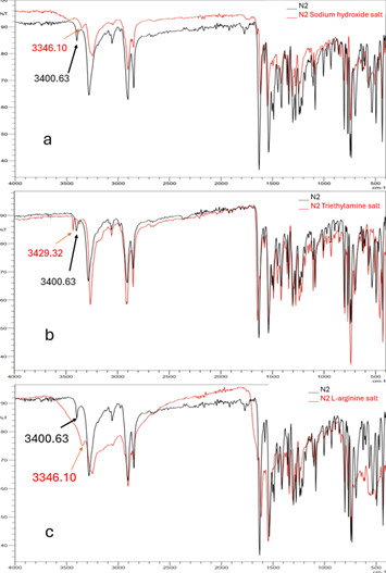 Figure 1. Comparison of the FTIR Spectra of N2 with various salt forms of N2, a) N2 and sodium salt of N2 b), N2 and triethylamine salt of N2, and c) N2 and L-arginine salt of N2